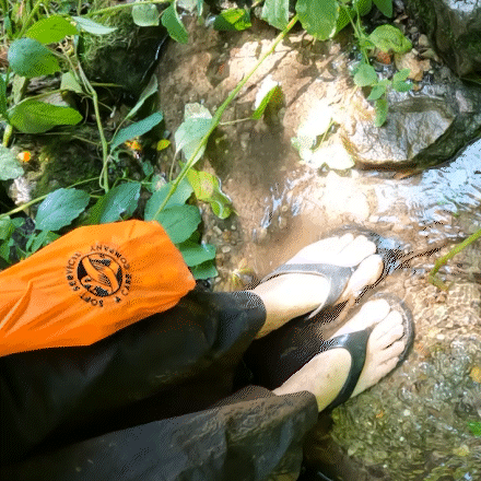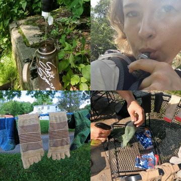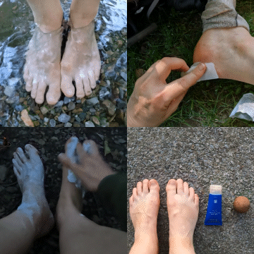 PM: Rinse or soak in a stream, if I’m lucky! Spray for bugs. Massage arches with a small cork ball + moisturize with Speed Soak to rehydrate skin and treat any cracks on heels and toes. Hydrated feet are more resilient to friction, meaning fewer blisters and raw spots. Feet also swell 0.5-1x their size after walking 15-20 miles per day, so massaging them with lotion helps increase circulation, reduce inflammation, and minimize soreness. Lastly, sleep in dry toe socks. |